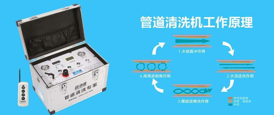 產品特點:經過歐盟CE安全認證機器,通過國內機器產品質量檢測,清洗設備采用熱熔垢+脈沖頻率+殺菌抑菌,水槌直沖、順洗逆洗、螺旋和周波震蕩的先進技術管道清洗設備,公司的管道清洗技術為國內創新、效果佳,解決自來水管道污染之難題。